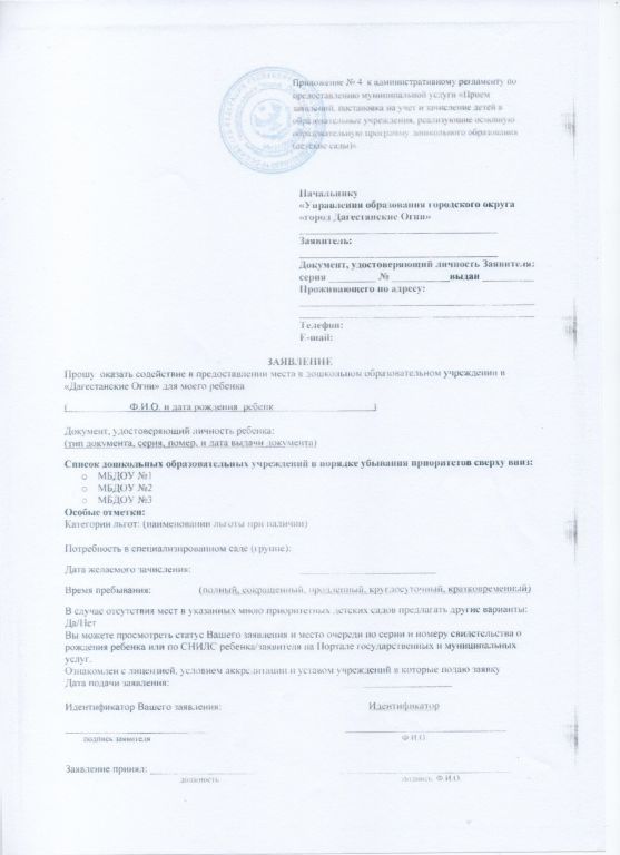 Примерная форма заявления о приеме в образовательную организацию